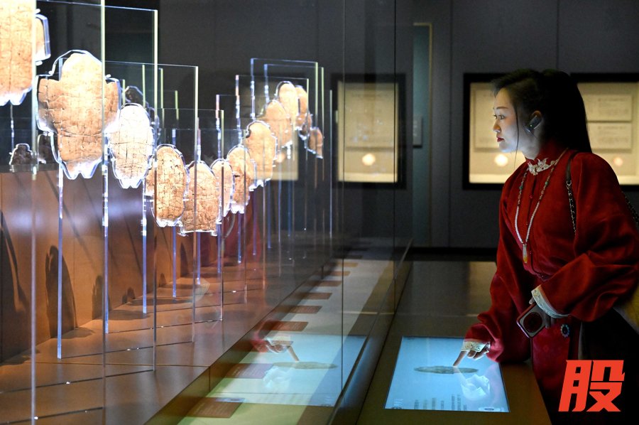 参观者在河南安阳殷墟博物馆新馆内观看展出的刻辞卜甲。